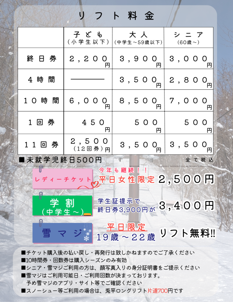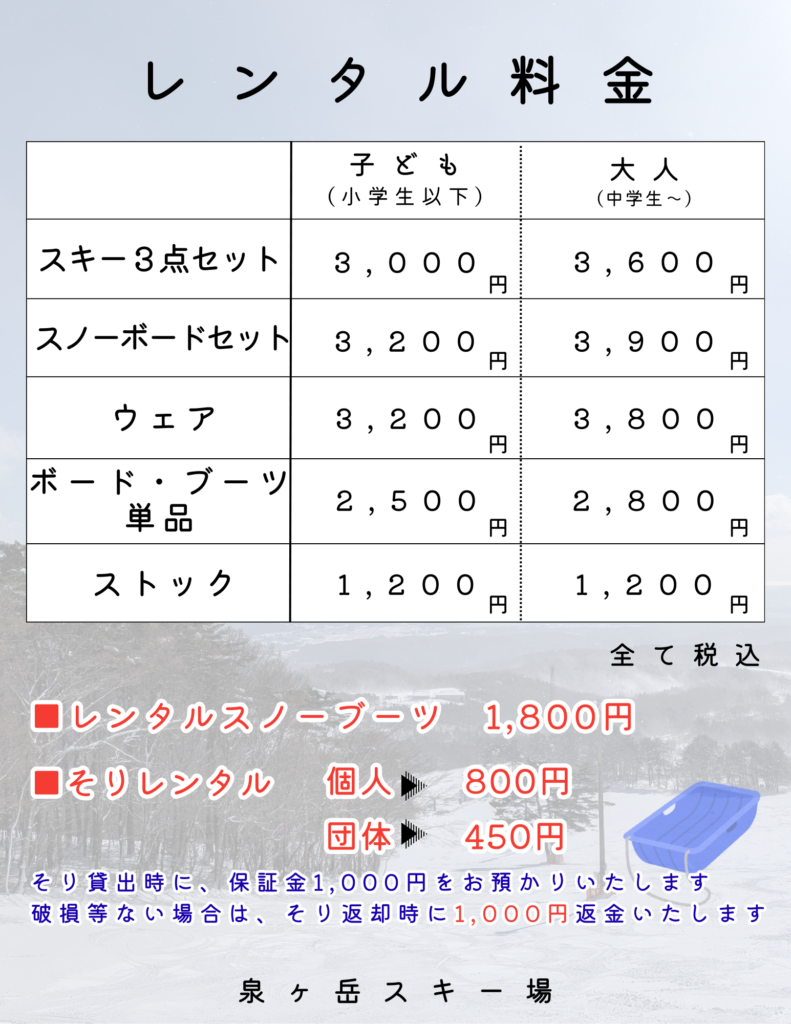 レンタル・リフト券料金