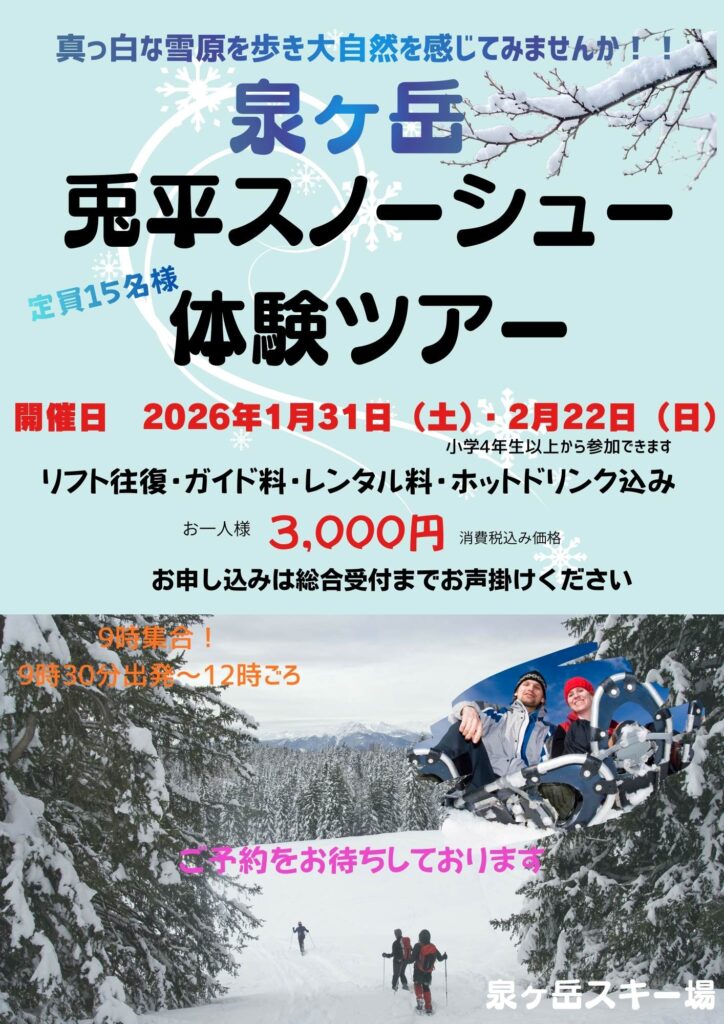 泉ヶ岳兎平スノーシュー体験ツアー1/31・2/22